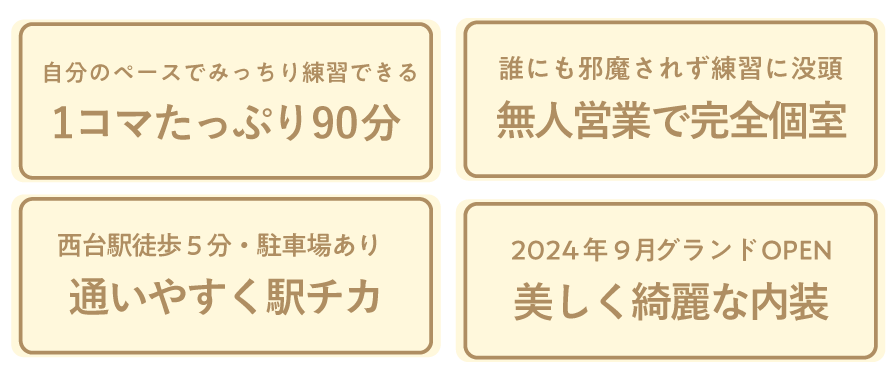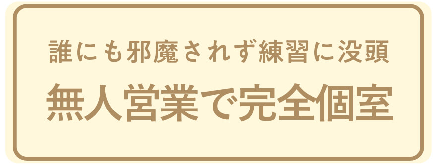 スタッフもおりませんので、周りの目を一切気にすることなく、自由に好きなペースで練習に没頭いただけます。